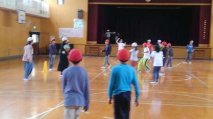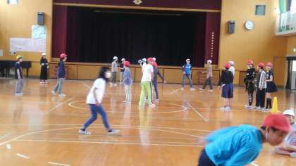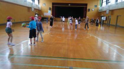 2時間目、6年生が講堂でドッチボールをしていました。