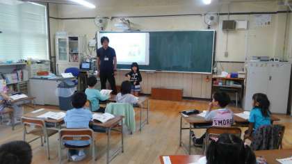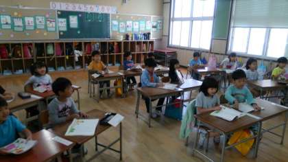 1時間目、1年生がこくごの学習をしていました。「あいうえおのうた」「あめですよ」「ふたとぶた」を学習していました。