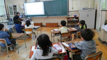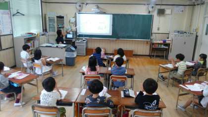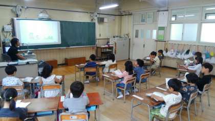 1時間目、1年生がこくごの学習をしていました。「あ」と「め」のひらがなを学習しました。
