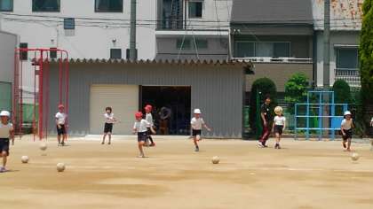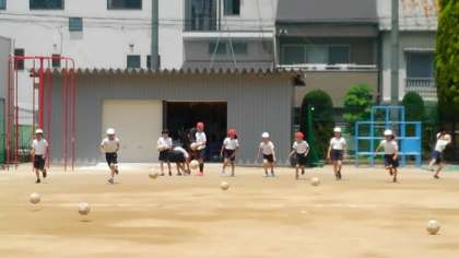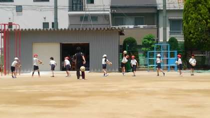 4時間目、3年生が運動場で体育の学習をしていました。ハンドボール投げの練習をしていました。