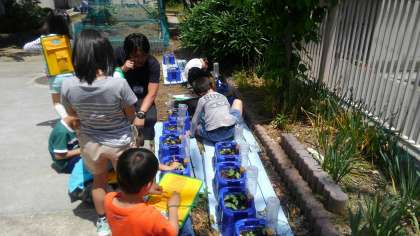 3時間目、1年生が自分が育てているあさがおの観察をしていました。