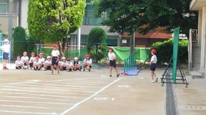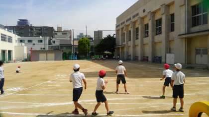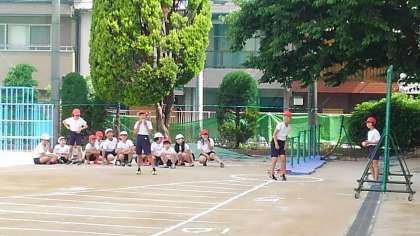 今日は、各学年新体力テストを実施しています。ボ—ル投げ、40m走、反復横とび、シャトルランを順番に行います。