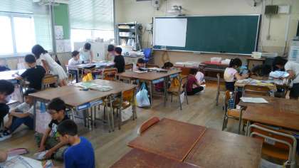 1時間目、3年生が社会科の学習で、先週の校区探検で調べた町の様子を、地図にまとめていました。