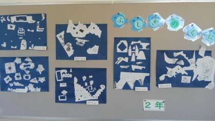 2年生が作った作品が教室と廊下に展示していました。題は「ふしぎのくに」です。