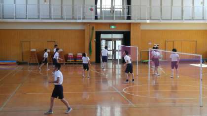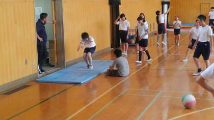 5時間目、6年生が講堂で体育の学習をしていました。新体力テストのたち幅とびの測定とバレーボールをしていました。