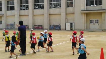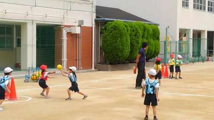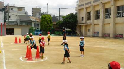 1年生が2時間目、運動場でコ—ンアタックゲームをしていました。