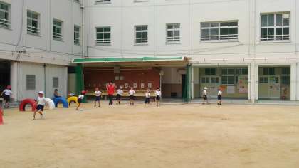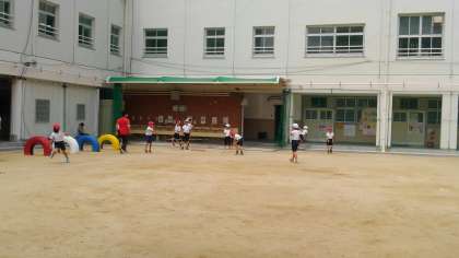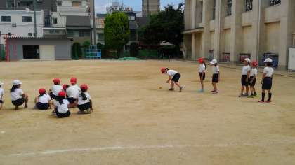 ボールの捕り方を練習していました。そのあと、前時と同じ、バックホ—ムゲームをしていました。