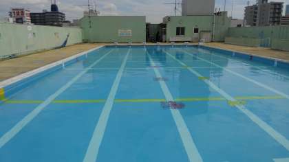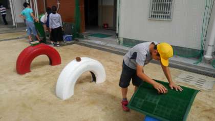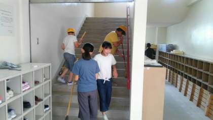 6時間目、6年生と先生方でプール開きに向けて、講堂内の階段、更衣室、マットなどの清掃をしました。