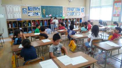 3時間目、2年生が先週グループに分かれて、町たんけんをした場所について、インタービューしたことを発表していました。