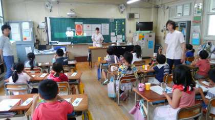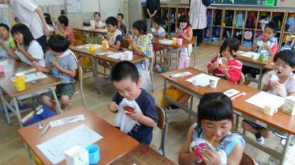 3時間目、2年生に歯科校医の石川先生と歯科衛生士の先生から、歯の磨き方を指導していただきました。