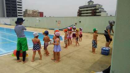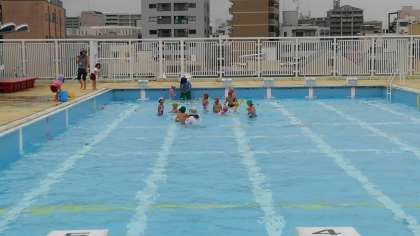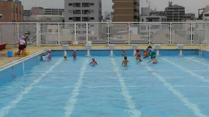 お昼休みに、東小橋幼稚園の年長組の園児が、プール体験のため来校しました。