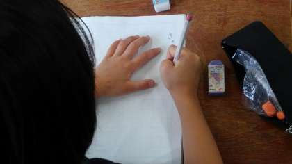 漢数字「八」「九」を習っていました。そのあと、「こんなことしたよ」の題で、作文の練習をしていました。
