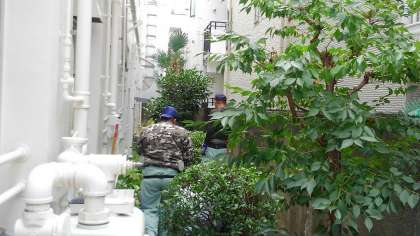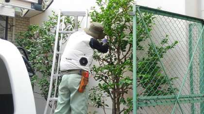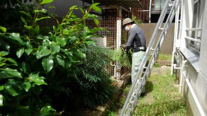 管理作業員の吉本さんと営繕の皆さまに、校舎周辺の樹木の手入れをしていただきました。