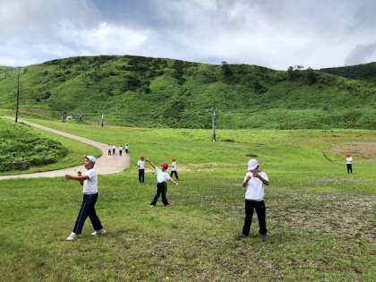 学校で作って持ってきたカタパルト飛行機とばしをしています!広い高原で飛ばすと楽しいです!
