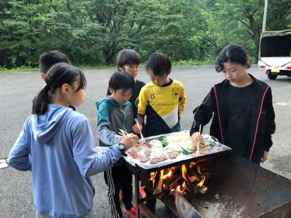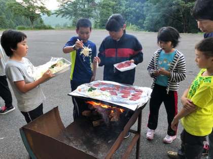 みんなで相談して焼いています!お野菜もお肉もしっかり食べましょうね!