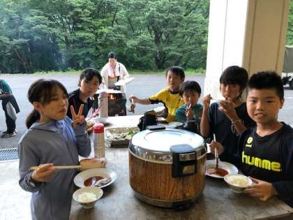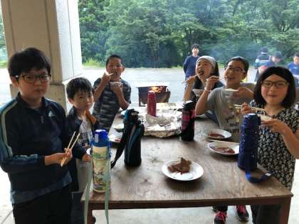 自然の中で食べると美味しいですね!みんな協力して、わけて美味しく食べています!