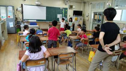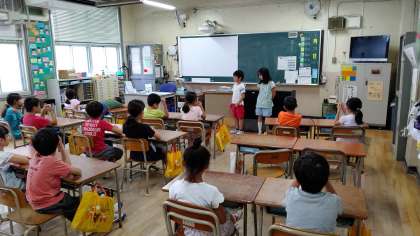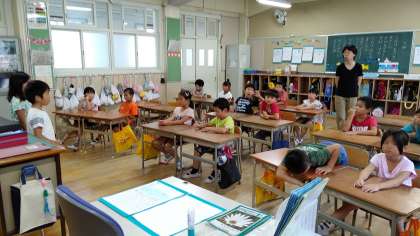 みんなの前で、夏休みの思い出を話していました。みんなの質問にも答えていました。