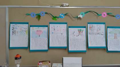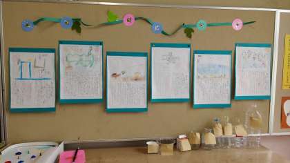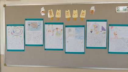 2年生教室と教室前の廊下掲示板に、夏の思い出を書いた絵日記が、展示されていました。