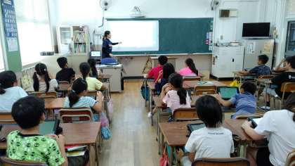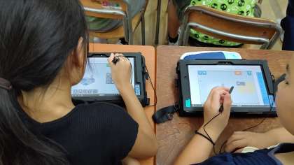 5時間目、4年生がタブレットを使ってプログラミング学習をしていました。