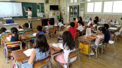 2時間目、2年生がこくごの学習をしていました。「空に ぐうんと 手を のばせ 」という詩を学習していました。