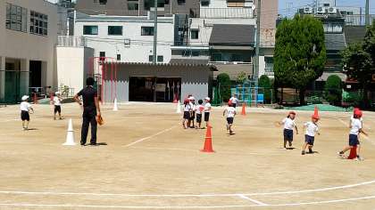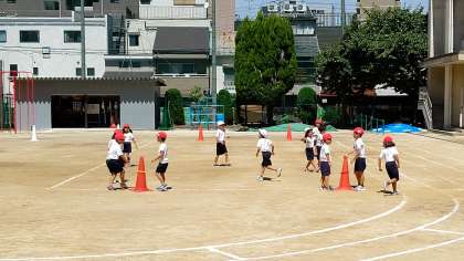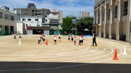 4時間目、1年生が運動場で運動会の練習をしていました。