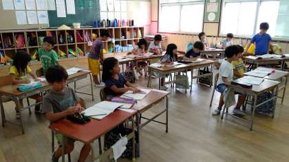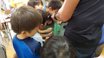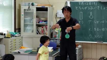 5時間目、1年生が算数の学習をしていました。丸い容器と細長い容器とどちらがおおいか予想していました。
