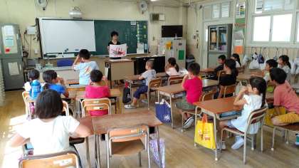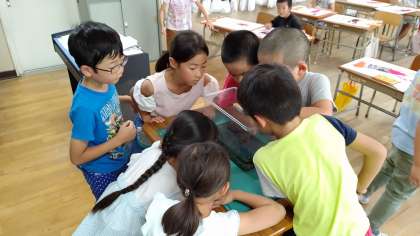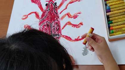 3時間目2年生が、前に描いていたザリガニの絵に、ザリガニのこどもを描き足していました。