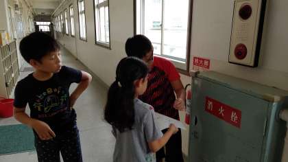 2時間目、3・4年生が社会科の学習をしていました。消防署のはたらきを学習していました。今日は、学校内の防火設備を調べていました。