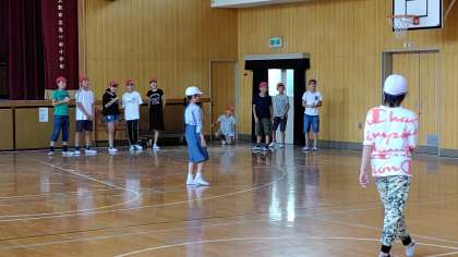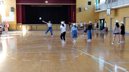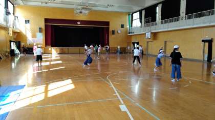 5時間目、6年生が講堂でキックベースボールをしていました。