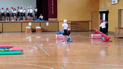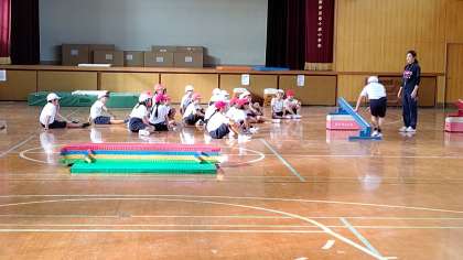 6時間目、4年生が講堂で体育の学習をしていました。5年生と同じく、「跳び箱」の準備運動をしていました