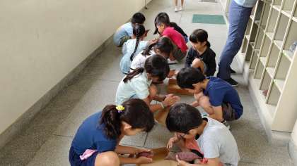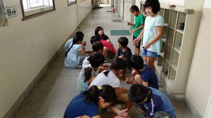 2年生ー昨日収穫したサツマイモの土を落として、新聞紙に包んで保存していました。