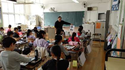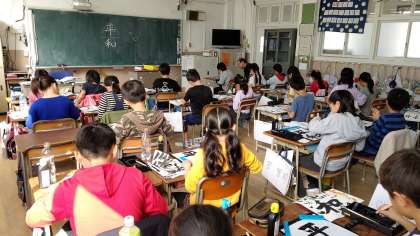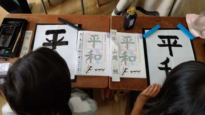 1時間目、 4年生が習字の学習をしていました。「平和」の漢字を書いていました。