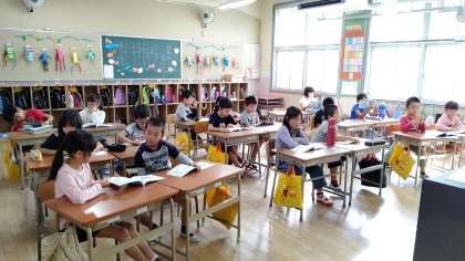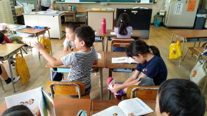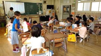 1時間目、2年生が国語の学習をしていました。漢字「岩」を練習したあと、「ぎゅうにゅう のむ」という詩を読んでいました。
