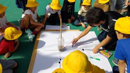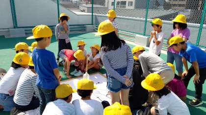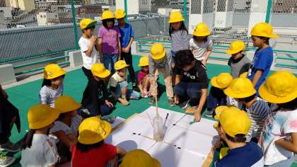 1時間目に西校舎屋上に置いた棒が、どの方向に、どのぐらい動いたかを調べました。