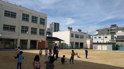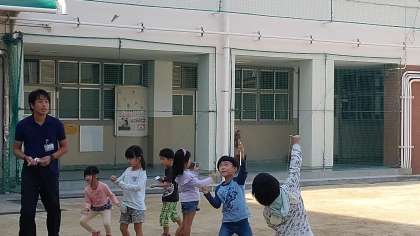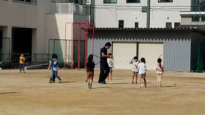 4時間目、1年生が運動場で紙飛行機を飛ばしていました。屋上近くまで、飛ばしている児童もいました。みんな楽しそうでした。