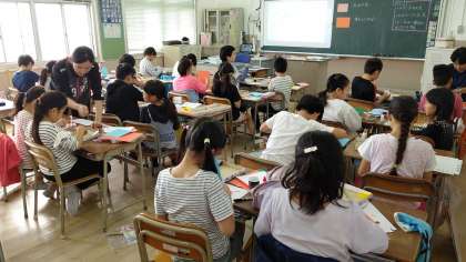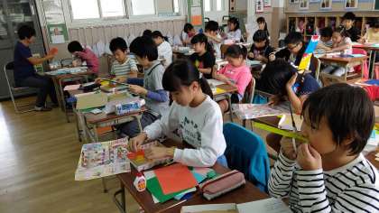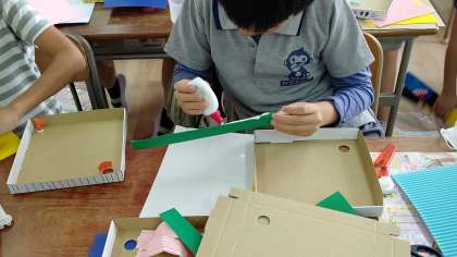5時間目、4年生が図工の学習をしていました。「コロコロガーレ」という遊具を紙で作っていました。