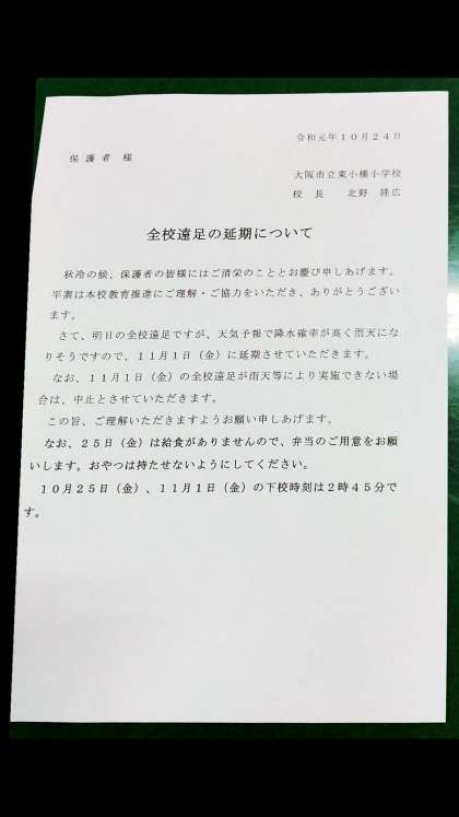 明日の全校遠足ですが、天気予報で降水確率が高く雨天になりそうですので、11月1日(金曜)に延期させていただきます。