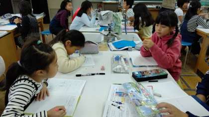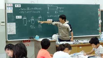 2時間目、4年生が理科室で理科の学習をしていました。「とじこめた空気のせいしつ」について、みんなで、考えていました。