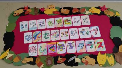 5年生の学級目標の周囲の飾りが、秋の装飾に変わっていました。