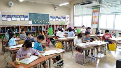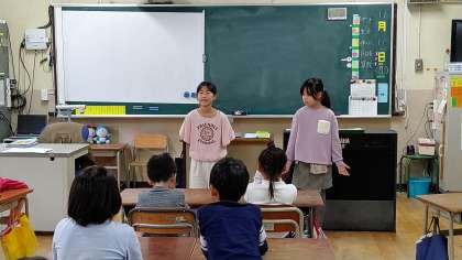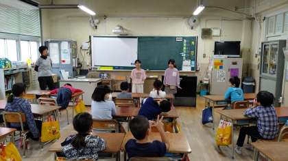 朝の会で、係りの児童が前に出て、お話をしていました。