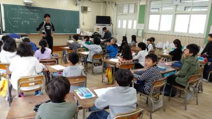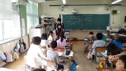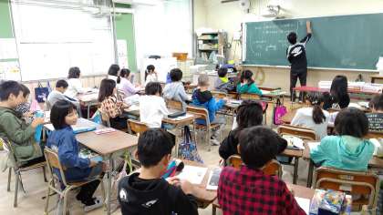 1時間目、3年生が算数の学習をしていました。「重いものをはかってみよう」を学習していました。テープ(ディスペンサー)の重さを予想していました。