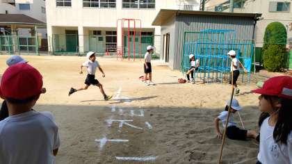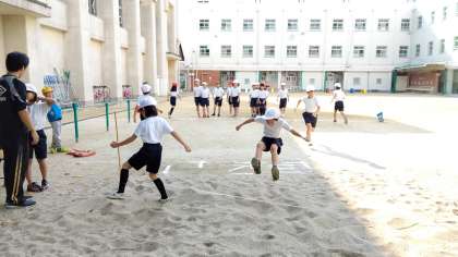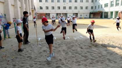 2時間目、3年生が体育の学習をしていました。運動場で「走り幅跳び」をしていました。