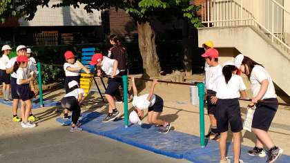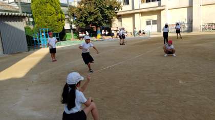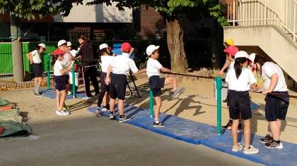 6時間目、4年生が運動場で、鉄棒とゴムを使って、走り高跳びの練習をしていました。