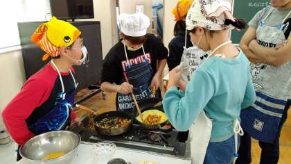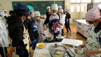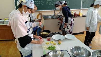 5時間目、6年生が調理実習をしていました。グループごとに、みんなで分担して、上手に作っていました。