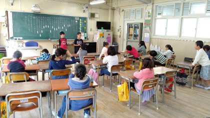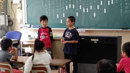 2年生が、朝の学級活動をしていました。係りの児童が前に出て、お話をみんなにしていました。