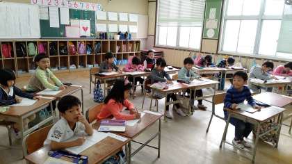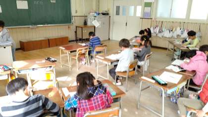 2時間目、1年生が国語の学習をしています。2時間目は校長先生が自習監督をしています。
