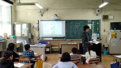 漢字の学習のあと、「そうぞうして お話を書こう」で、みんなが書いた物語を先生が読んでいました。