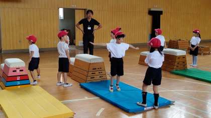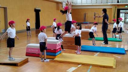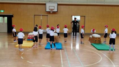 4時間目、1年生が講堂で体育の学習をしていました。「跳び箱」の練習をしていました。