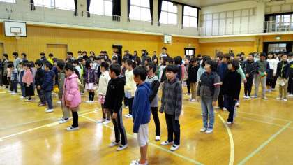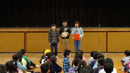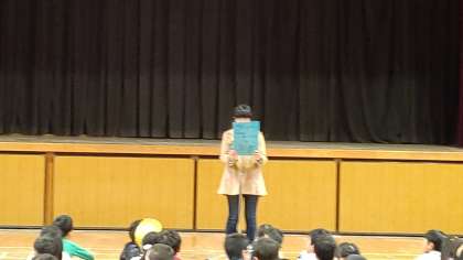今日は、雨天のため、講堂で全校朝会がありました。表彰状の伝達、校長先生のお話のあと、健康委員会、代表委員会の児童から連絡がありました。