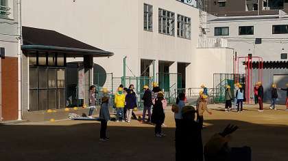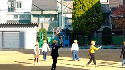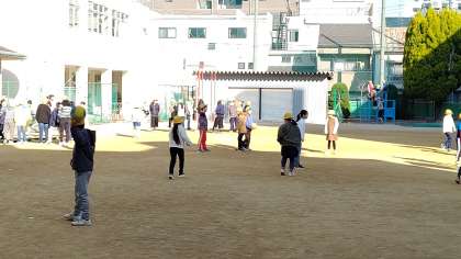 1時間目が終わって、運動場で4年生から6年生までの児童が、元気に遊んでいます。